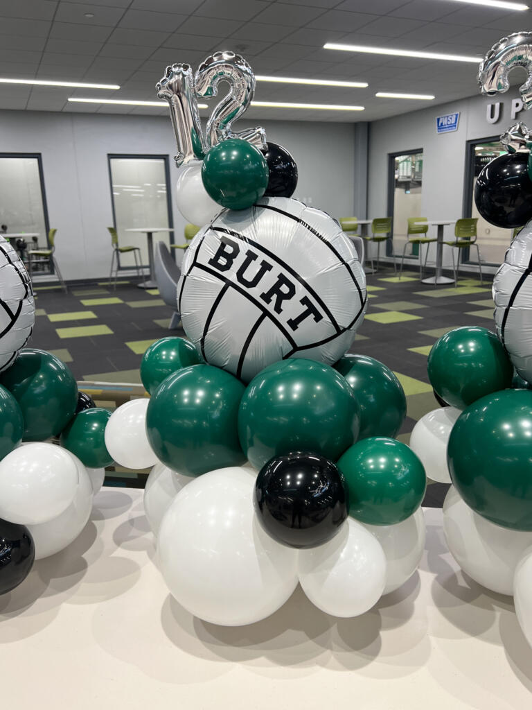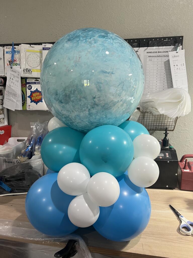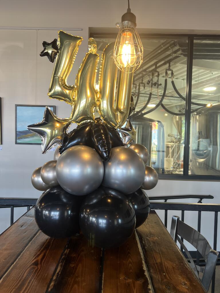 A layered balloon centerpiece with a custom Mylar topper that adds the right amount of personality and polish. Versatile enough for both corporate settings and personal celebrations.
